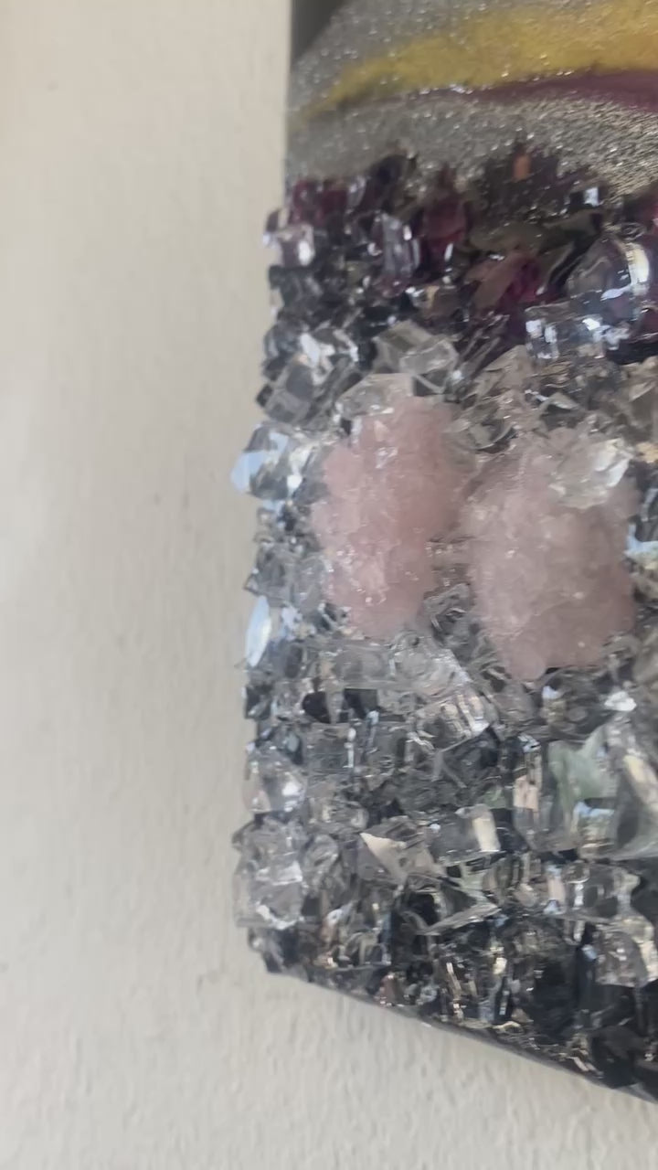 Black Gold and Pink Geode Wall art on Canvas. This is a beautiful 12x8 hand made piece with glass amethyst stone and hand made crystals. Beautiful deep black background allows the colors to pop from the canvas. Lux handmade hard with a mirror like glass finish.